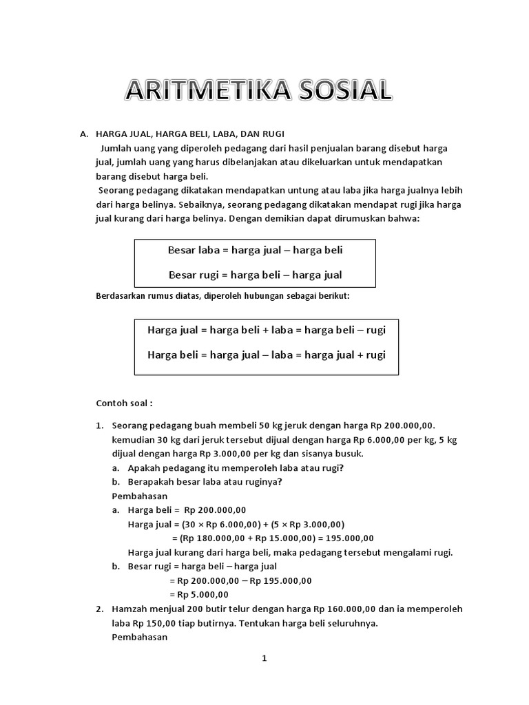 Contoh Soal Aritmatika Sosial. Pada materi aritmatika sosial jenjang smp kita akan diajarkan mengenai masalah nilai suatu barang, harga jual, harga beli, untung, rugi, imp. Seorang pedagang membeli barang dengan harga rp20.000,00 dan dijual mendapatkan untung 20%.
