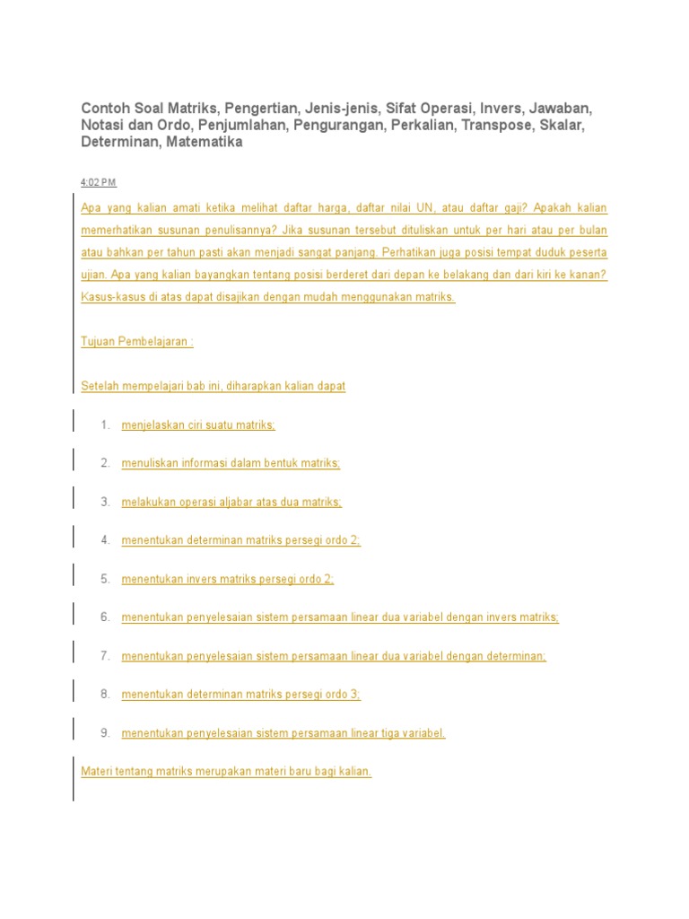 Contoh dialog to state rules and obligations. Postingan ini membahas contoh soal determinan matriks, transpose matriks dan pembahasannya atau cara menentukan determinan matriks ordo 2 x 2, misalkan matriks a = \begin {bmatrix}a & b. Contoh soal matriks dan pembahasan matriks. Rumus invers matriks beserta contoh soal.